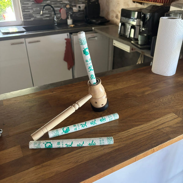 Le moxa est une méthode de la médecine traditionnelle chinoise qui consiste à brûler un bùton d'armoise pour réchauffer des points spécifiques du corps. Cette chaleur stimule le Qi et rétablit l'équilibre énergétique.